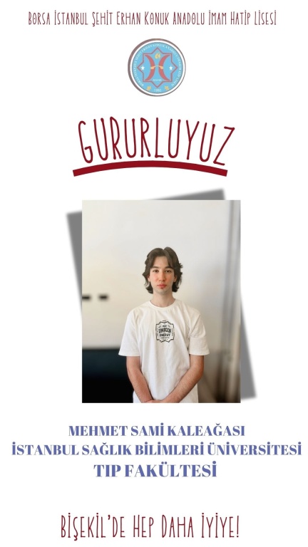 2025 YKS tercih sonuçlarına göre Borsa İstanbul Şehit Erhan Konuk Anadolu İmam Hatip Lisesi(Bişekil) Öğrencisi Mehmet Sami Kaleağası Tıp Fakültesine yerleşerek Pozantımıza büyük bir sevinç yaşattı.