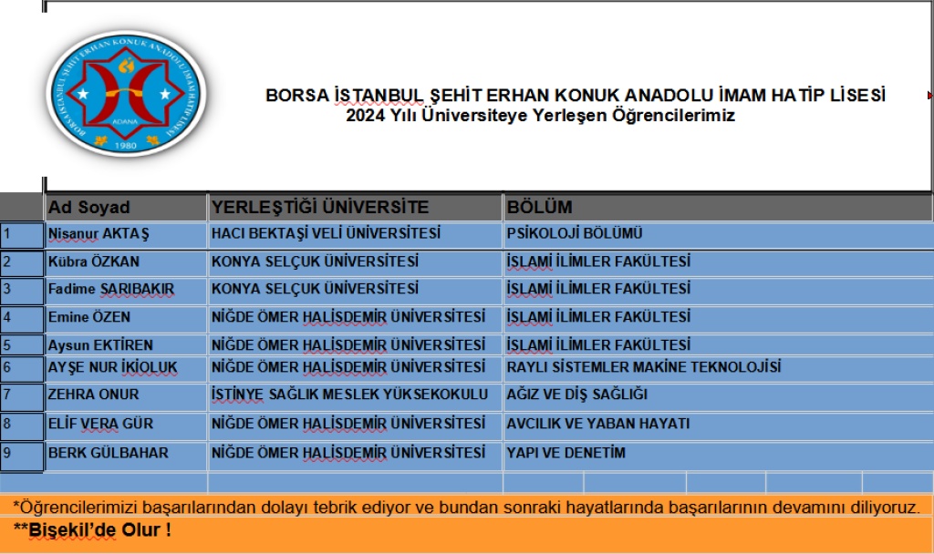 Ad Soyad | YERLEŞTİĞİ ÜNİVERSİTE-BÖLÜM | ||||||||